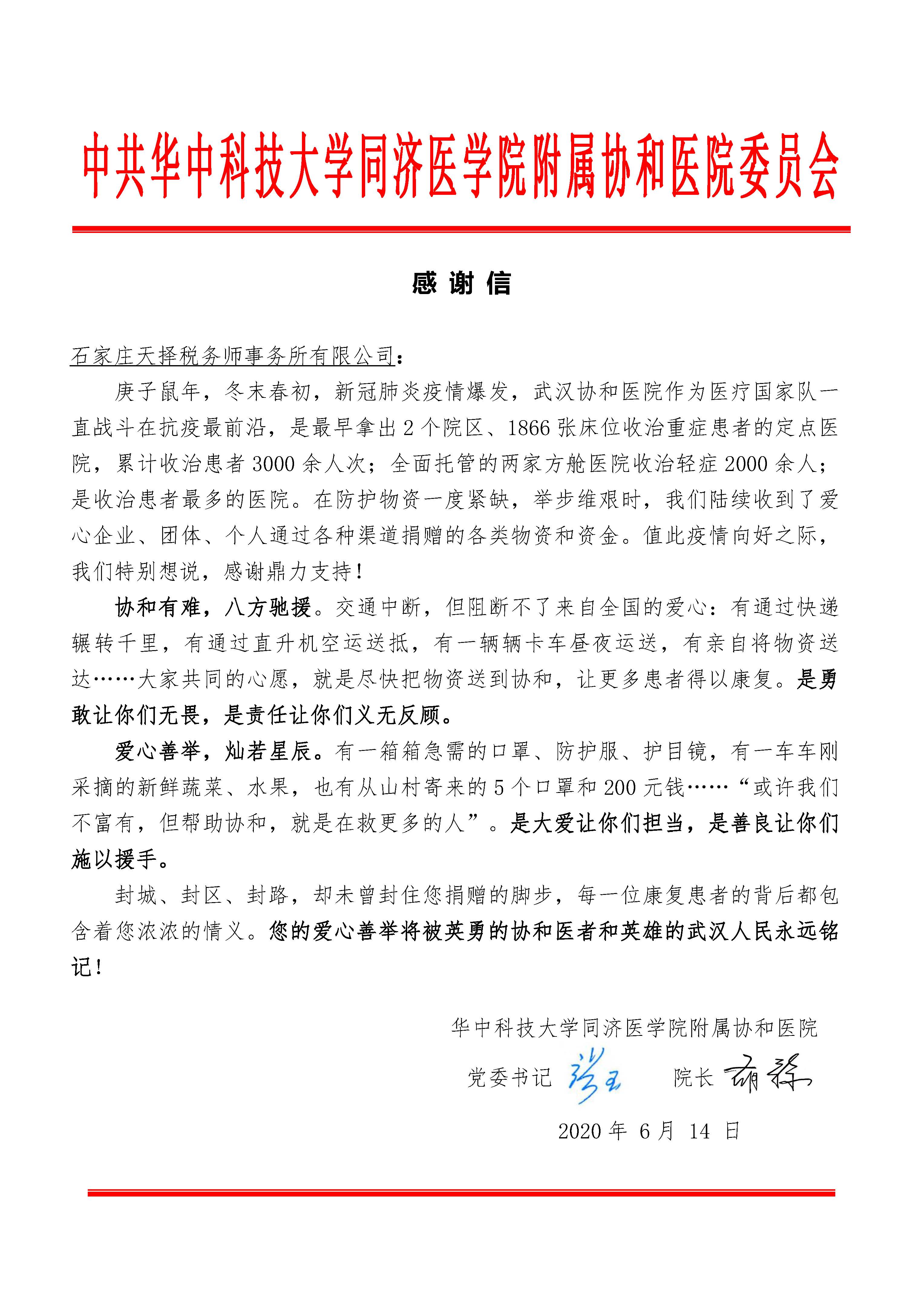 中共華中科技大學同濟附屬協和醫院委員會感謝信